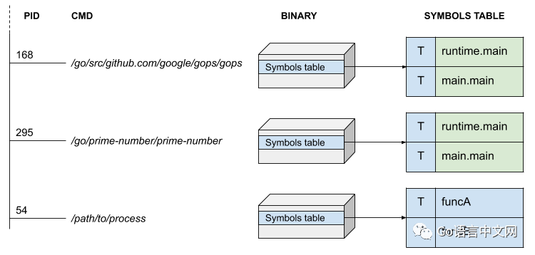 首先,gops 列出所有的进程。接着,对于每个进程,它打开二进制文件读取符号表: