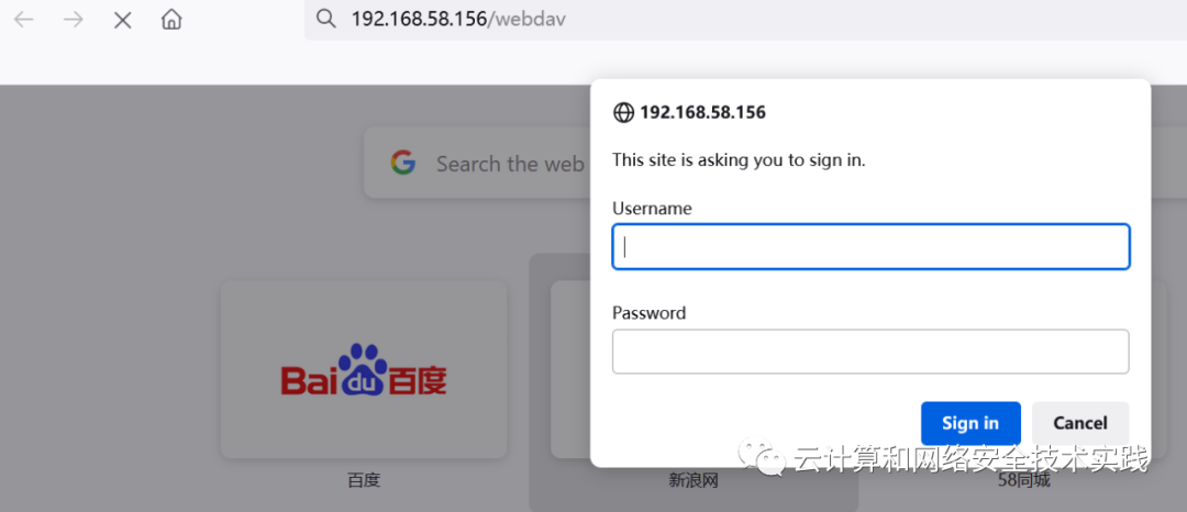 浏览器访问http://192.168.58.156/webdav,需要用户名密码,