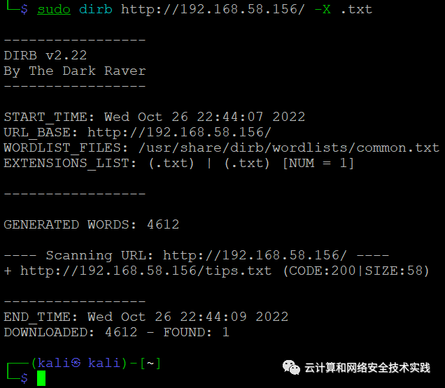 目录文件爆破,sudo dirb http://192.168.58.156/ -X .txt,