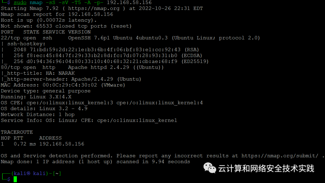 继续做端口扫描,sudo nmap -sS -sV -T5 -A -p- 192.168.58.156,