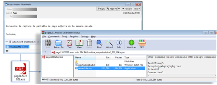威胁组织通过向目标投递包含附件的钓鱼邮件,以发票为诱饵诱使目标下载包含一个解压(SFX)文件的ZIP文件,第一个压缩文件充当启动第二个压缩文件的渠道。第一个 SFX 文件进一步伪装 PDF 或 Excel 图标使其看起来合法,受密码保护的第二个 SFX RAR 文件,启动存档的批处理脚本,以及诱饵 PDF 或图像。批处理文件的执行会导致安装潜伏在受密码保护的 RARsfx [自解压 RAR 存档] 中的恶意软件 CoinMiner。