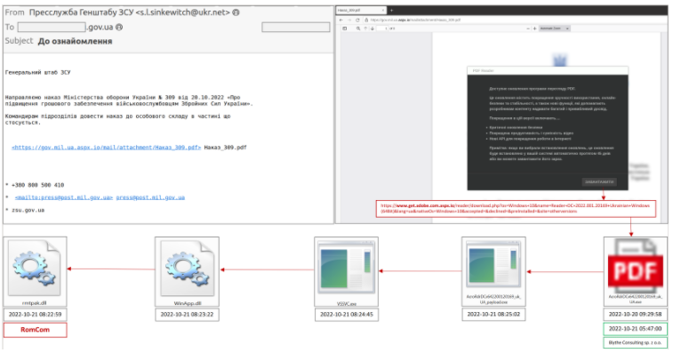 近日,乌克兰政府计算机应急响应小组(CERT-UA)发布声明称,监测发现乌克兰武装部队总参谋部新闻处遭到攻击。攻击者利用乌克兰武装部队总参谋部分发包含用于下载“订单”的第三方网络资源链接的电子邮件,网页以关于需要更新软件(PDF阅读器)的消息诱导用户点击“下载”按钮,下载 RomCom恶意软件的可执行文件“rmtpak.dll”。根据 RomCom 后门的使用以及相关文件的其他功能,CERT-UA 将该恶意软件疑似归属于 Cuba 勒索软件活动。