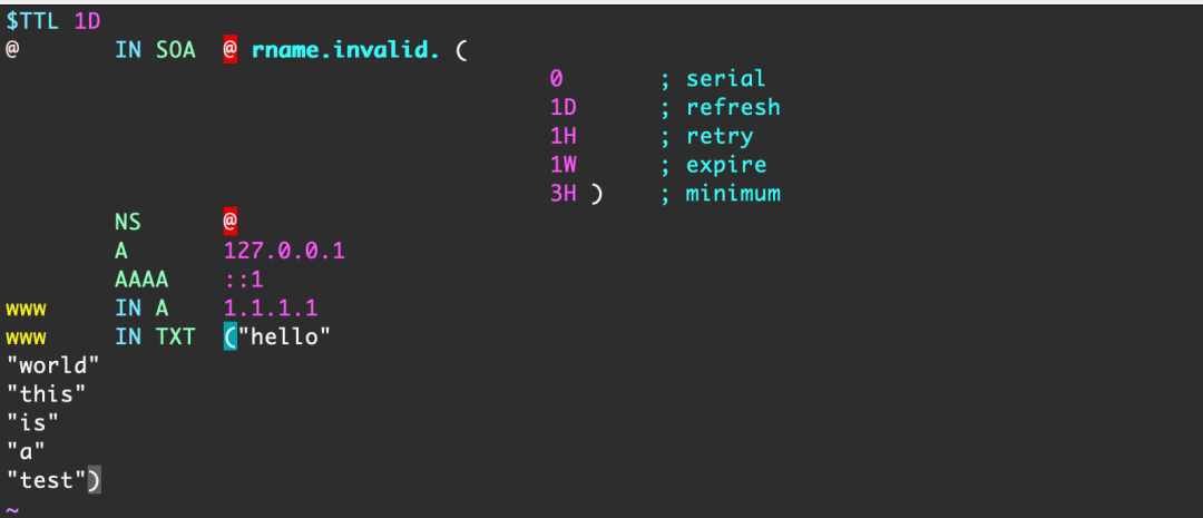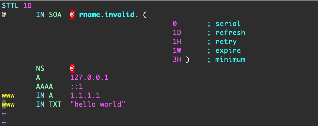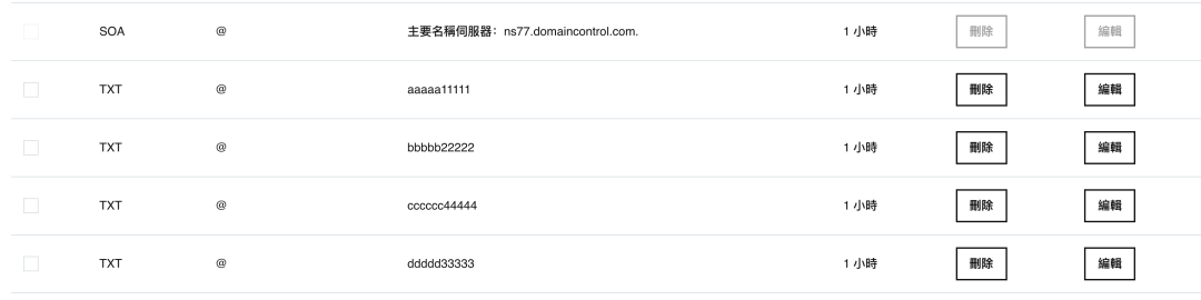 默认内容就是上面这样的,我们可以在这里添加我们要的各种记录,这里只涉及 TXT 记录