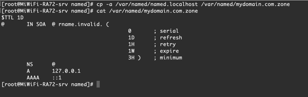 我们直接复制一份 /var/named/ 目录下的 named.localhost ,使用 cp -a 会直接把对应的权限设置也一并 copy 给新文件 mydomain.com.zone