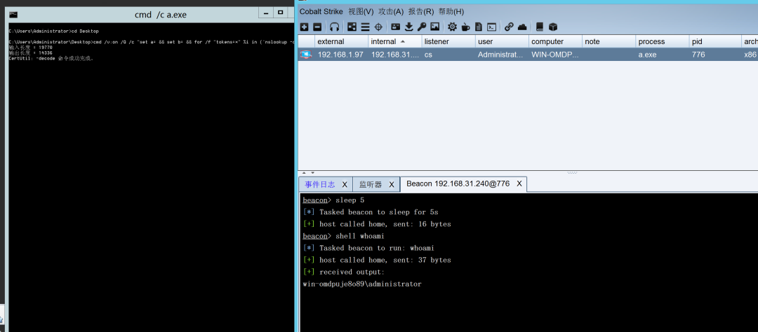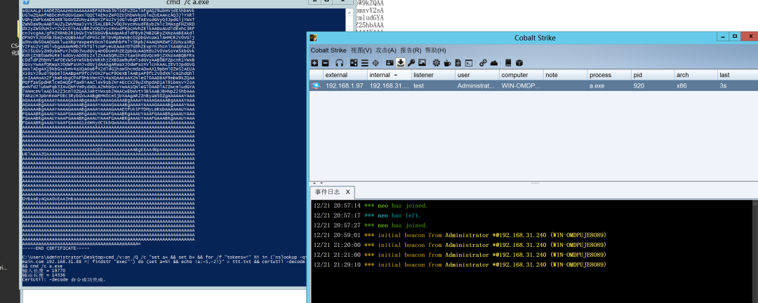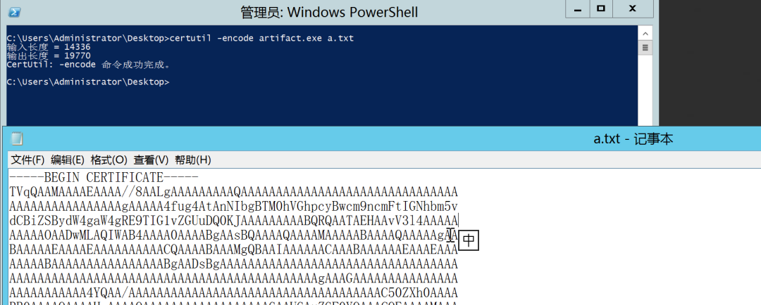 既然输出没有问题了,可以进行转换了,这里又涉及一个问题:certutil 只能对文件进行转换,所以我们需要将输出字符串输出到文件中,再使用 && 进行连接命令,转换字符串为二进制可执行文件