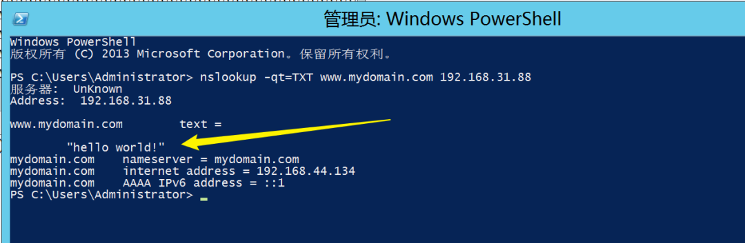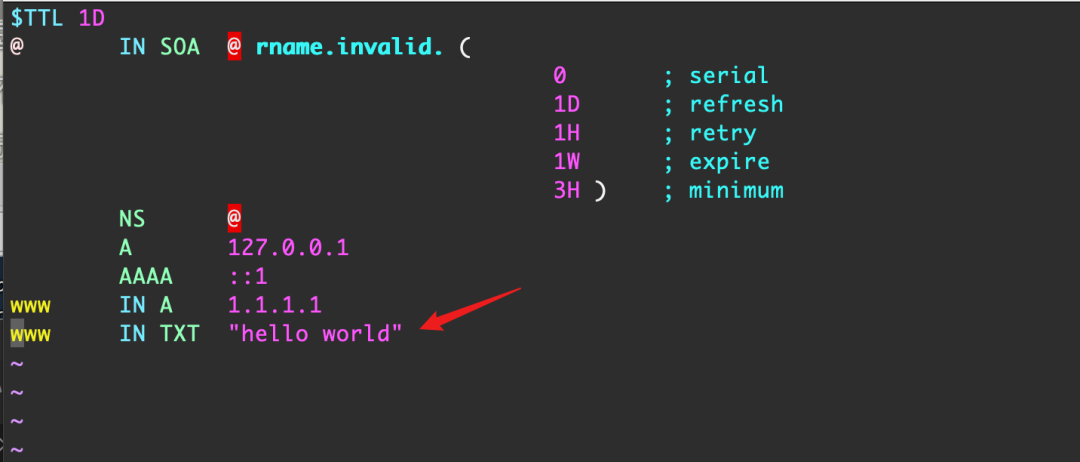 同时,我们为 www 子域名添加了一条 TXT 目录,并且设置其值为 "hello world"