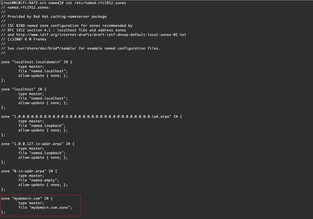 在辅助区域配置文件/etc/named.rfc1912.zones中,添加一条我们自己创建的区域
