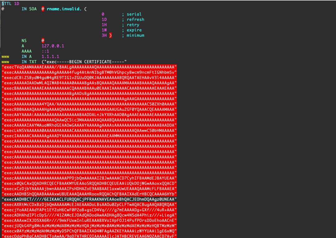 那这里就涉及一个问题了,是不是 TXT 记录最大就 1024个字符呢?这件事就别百度了,如果百度,它会告诉你最大可能只有 256 个字符,所以我就使用了比较流行的 BIND 作为 DNS 服务器自己搭建了一个