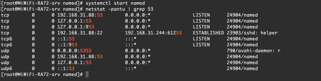 成功启动,可以看到 53 端口监听在 192.168.31.88 上,大坑出现了,centos 默认会开启防火墙,所以需要关掉或者开启相关策略,这里粗暴一些,直接关掉