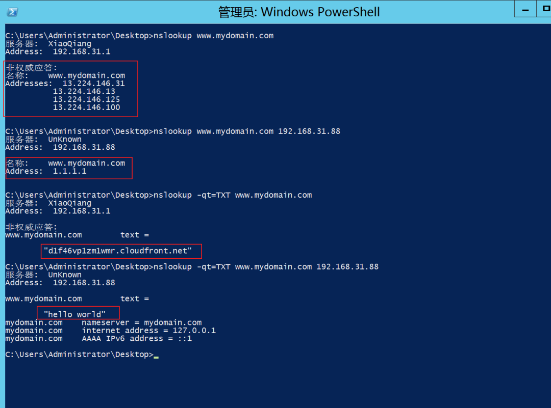 其中 192.168.31.88 这个参数就是让系统委托 192.168.31.88(攻击者自己搭建的DNS服务器) 来为 www.mydomain.com 进行解析,如果不加这个参数,那么系统会使用自己配置的DNS服务器进行解析,可能是内网DNS服务器、路由器、 8.8.8.8 或者本地运营商DNS等等,企业环境可能就是企业内网中自建的 DNS 服务器