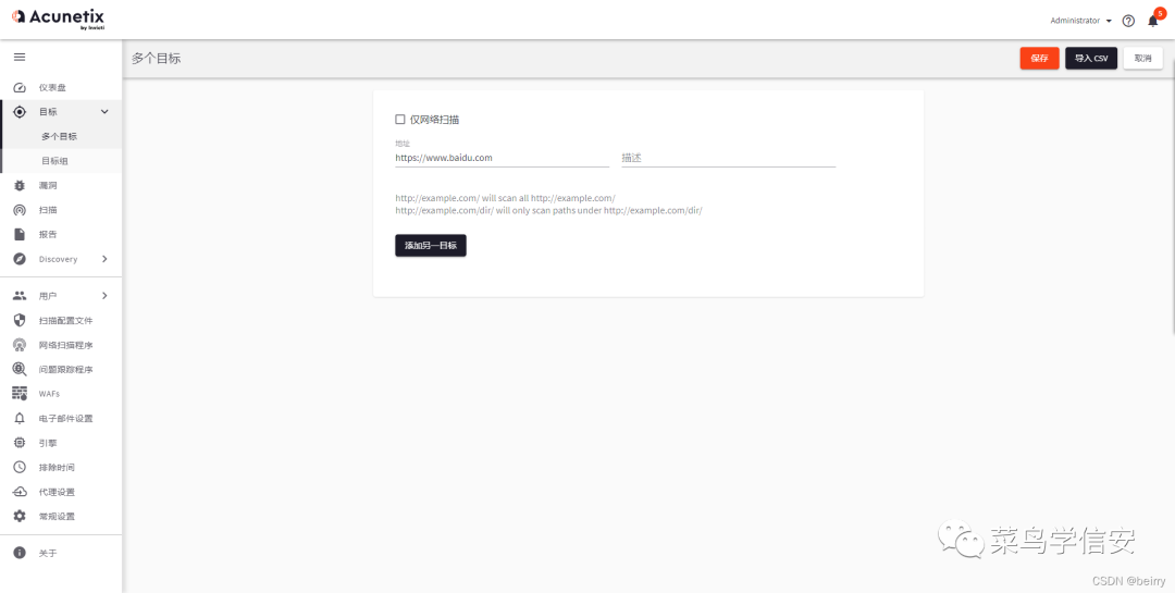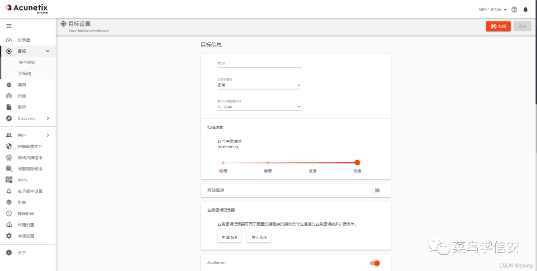 业务关键性:有四个选项,低,正常,严重,高,根据业务的重要程度来选择默认扫描配置文件:全扫描,高风险,高/中风险,跨站脚本,SQL注入,弱密码,仅抓取,恶意软件扫描;根据你想着重检测哪一方面的漏洞来选择