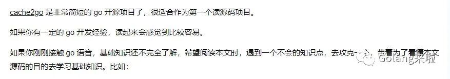 所以,如果想要提高 Go 语言编程水平的同学,不妨多阅读源码。如果不知道从哪里开始,不如就从 cache2go 开始。