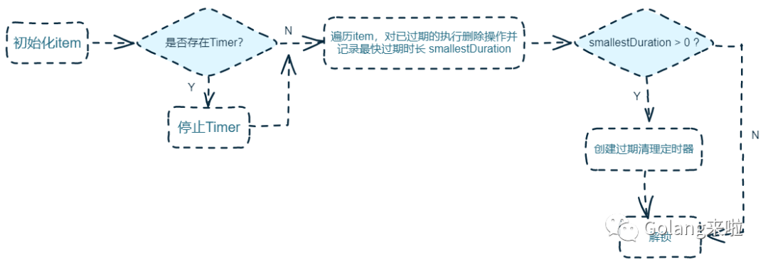 可以看到 expirationCheck() 方法实现了一个动态的清理器,每次执行的时会找出最快过期的 item 的存活时长 smallestDuration,根据这个值定义一个定时器,到点执行清理函数,这样往复循环。