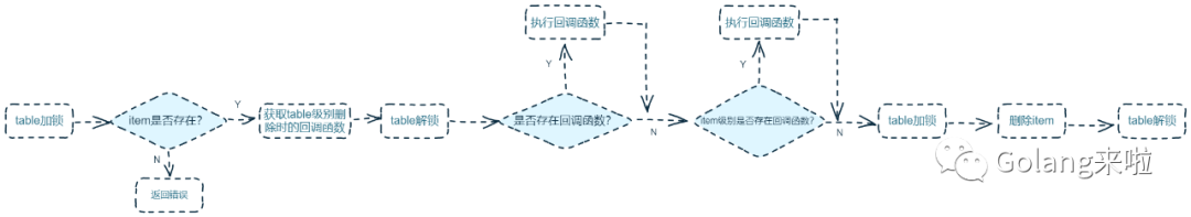 除了 item 过期时会自动调用删除方法之外,cache2go 对外还提供了 Delete() 方法手动删除 item。