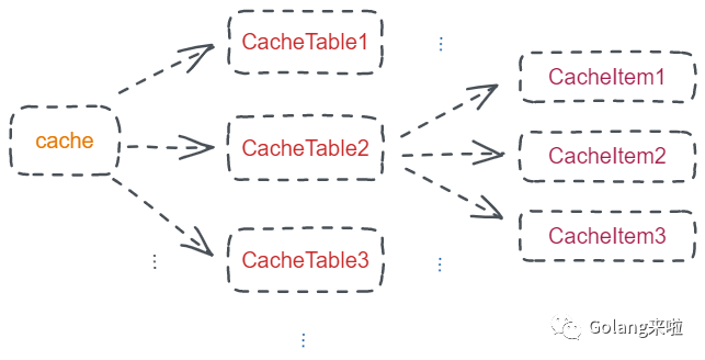 可以看到代码主要集中在 cache.go、cachetable.go、cacheitem.go 三个文件中,主要的数据结构有三个: