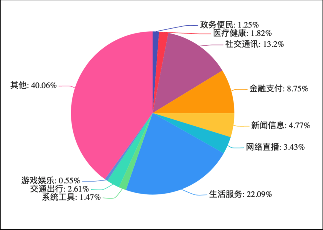 截止2022年10月底,通过潮启移动端安全管控平台共监测到山东省移动应用数量为11118款(不含历史版本),通过对移动应用行业分布数据追踪发现,目前山东省移动应用行业数量排名靠前的为生活服务类,约2435款,较09月份新增4款;社交通讯类约1455款,较09月份新增2款;金融支付类约964款,较09月份新增2款;新闻信息类约526款。