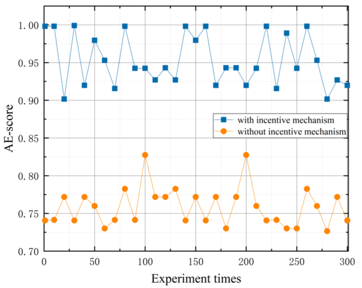 图7对比了有无激励机制下CATM的性能。因为参与信任评估的节点越多,信任评估的准确性越高,但消耗的能量也越多。本文提出的信任管理方案需要平衡能耗和评估准确性,因此这里用AE得分表示信任评估准确性与能耗之比的归一化结果。从图7可以看出,有激励机制的AE得分更高,这意味着相同能耗时有激励机制的信任评估方案更准确。