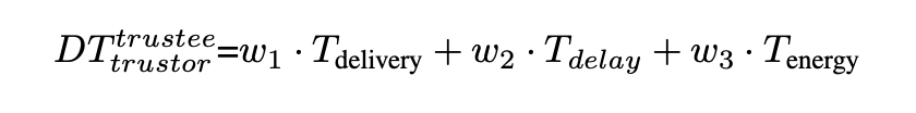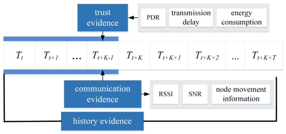 1)信任计算:如图4所示,CATM方案中采用了滑动时间窗口机制。每个时隙都进行信任证据收集和直接信任计算,因此当前的信任值可以作为历史信任在下一时隙进行新的信任评估;同时也会收集RSSI、SNR和节点移动信息之类的通信证据来计算链路可靠性。被信任者的直接信任是基于数据包交付率、传输延迟和能量消耗三个信任证据的信任加权求和: