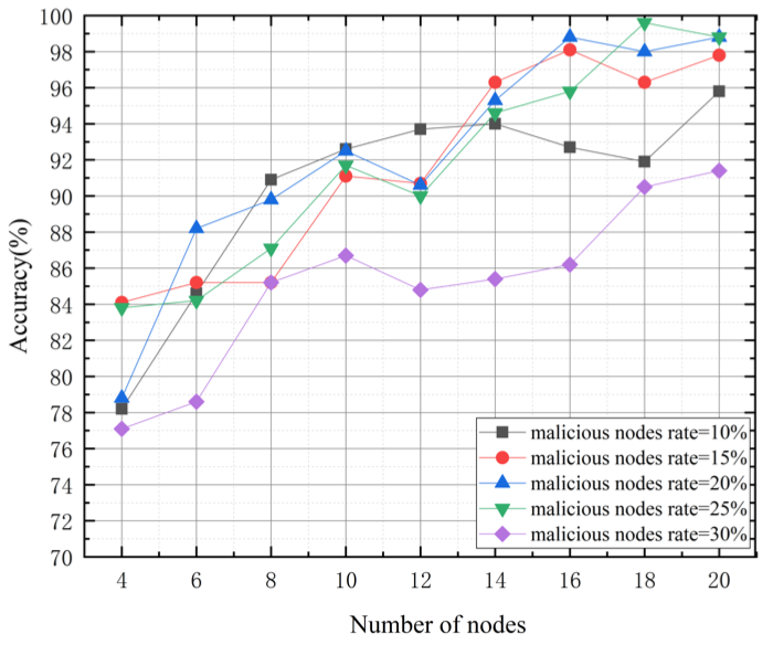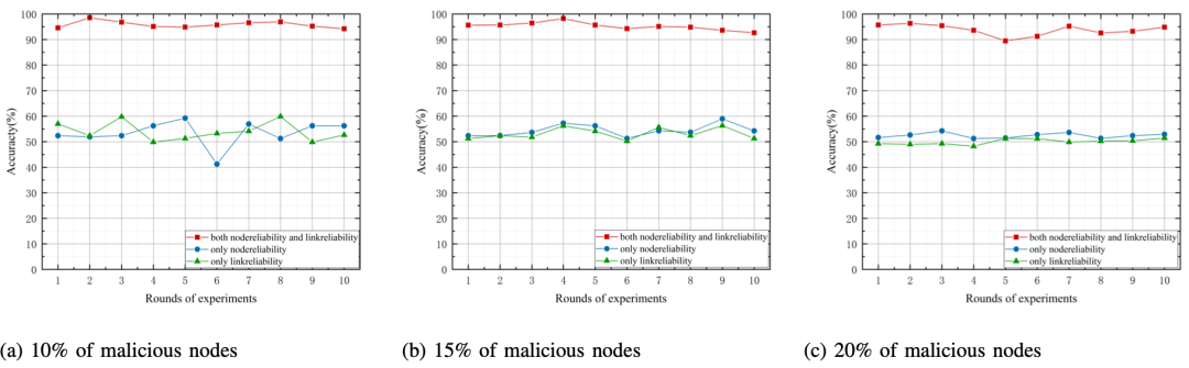 节点间交互和通信质量的异质性会导致错误或不诚实的推荐,从而影响信任评估的准确性。为此,本文将所提方案与只考虑节点可靠性和只考虑链路可靠性进行对比,研究了不同恶意节点比例下的各方案的性能,如图5所示。可见,在不同恶意节点比例的情况下同时考虑节点可靠性和链路可靠性的性能更佳。