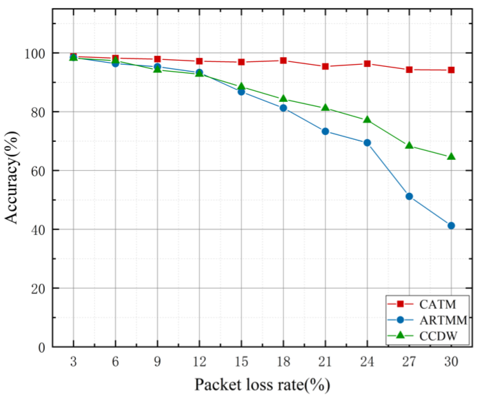 ARTMM只考虑不诚实的信任推荐;CCDW认为含有不诚实推荐信息的数据包在传输过程中的传输延迟更高,但是水声通信本身就存在延迟,使用传输延迟判断推荐诚实与否是不准确的。图8给出了三种方案的信任评估准确性随数据包损失率的变化情况,其中ARTMM和CCDW两种机制的评估准确性急剧下降,因为随着数据包损失率增加,不正确推荐也在增加,而这两种方案无法准确区分错误推荐和不诚实推荐。因此,本文所提的CATM的评估准确率更高。