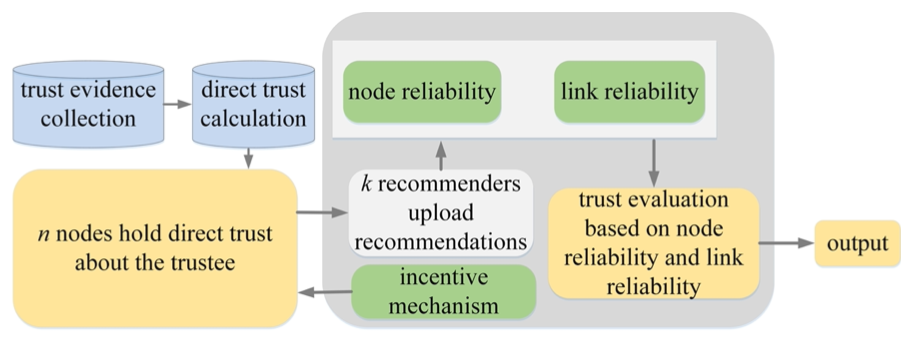 2)本方案研究了节点可靠性和链路可靠性,以解决信任冲突并提高信任评估的准确性。