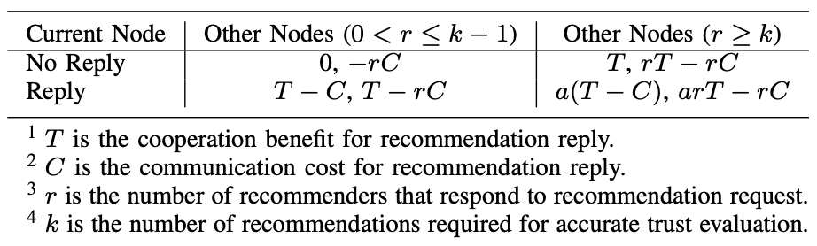 本文将推荐者分为两类,其中一个推荐者称为当前节点,剩下的推荐者称为其他节点。表I给出了基于通信成本C和合作收益T的博弈效用矩阵,即信任收益表,其中当前节点的策略为答复和不答复,其他节点的策略为最多有k-1个节点答复和至少有k个节点答复。以“a(T-C),arT-rC”为例,前者表示当前节点答复的信任收益,后者表示至少k个节点答复时的信任收益,此时达到了所需的推荐数k。当推荐数过多时又会增加能量消耗,但对信任评估的准确度影响微不足道,所以引入调整因子a进行收益调整。通过分析发现,一定可以保证有k个推荐用于完成信任评估,这也验证了该机制能够有效防止自私节点影响信任评估的准确性。