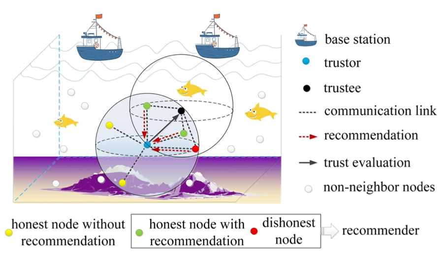 由于水声通信的带宽有限、传输延迟长,无法直接将陆地网络中的信任管理机制用于对水下传感网安全性能的评估过程。另外,因为IoUT的动态网络拓扑结构,需要动态更新被评估节点的信任评估。因此,针对IoUT设计的信任管理机制考虑了直接信任和间接信任,但是受恶意攻击和通信环境的影响,推荐节点提供的推荐可能是不诚实或错误的,造成信任冲突,而现有的方案都没有考虑有冲突的推荐信任。