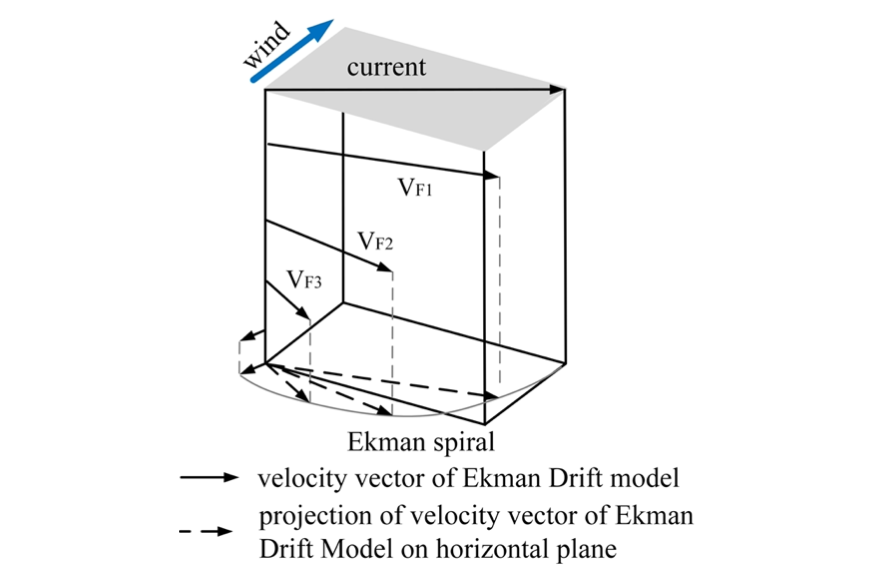 节点的移动会影响信任证据的获取,故本文假设节点随海水漂移,选用如图2所示的Ekman漂流模型模拟节点运动。该模型阐明了风力驱动上层海水的运动过程。海面风力对海水搅拌混合,使风的动量通过海面传给表面的海水后,因海水的粘滞性,依次传给下层的海水,使下层海水也流动起来。由于地转偏向力的作用,在北(南)半球,Ekman漂流的表面流速偏于风向右(左)45度。随着深度的增加,流向不断右(左)偏,流速也不断减小,直至某深度处流向和表面流向完全相反时,流速便约为表面流速的 4%。此深度称为摩擦影响深度。图2中标明了Ekman漂流的速度矢量及其在水平面上的投影。