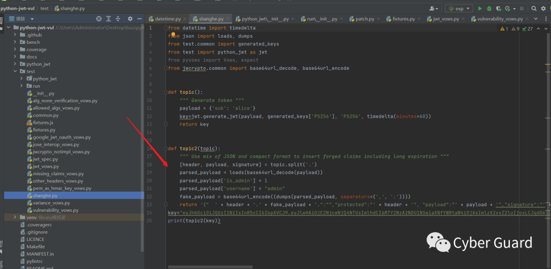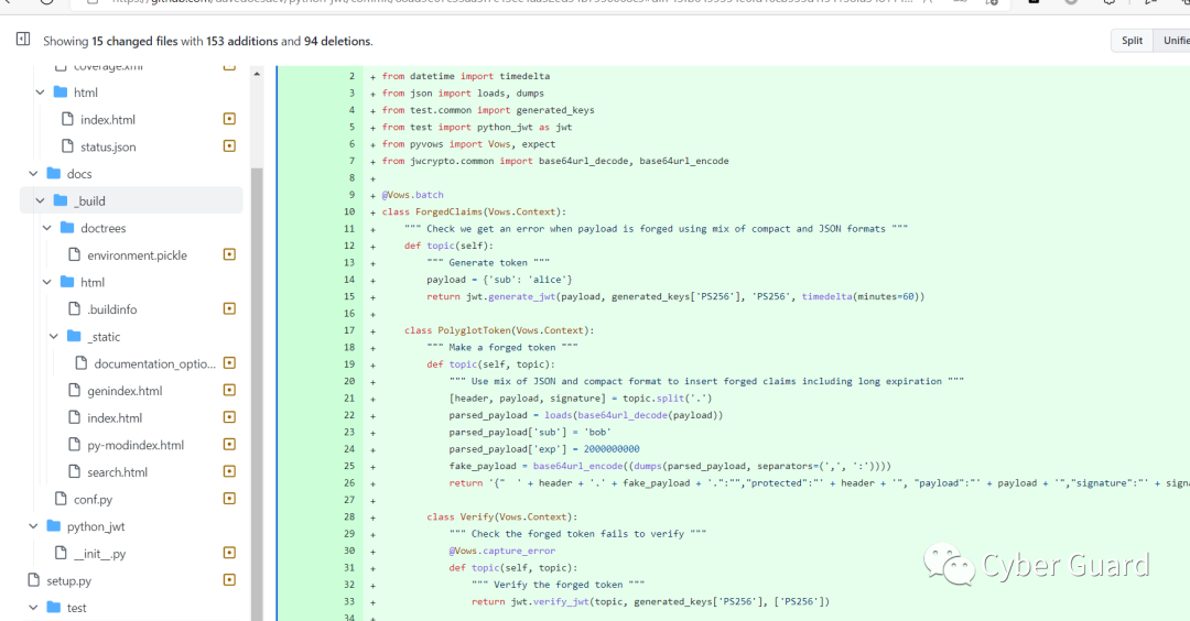 这里用到的jwt漏洞是这个CVE-2022-39227,有点新https://github.com/davedoesdev/python-jwt/security/advisories/GHSA-5p8v-58qm-c7fp这个题最骚的就是,新版的包还带有这个cve能生成恶意jwt的poc,这个包是想帮用户验证这个新包是否还有以前的问题。那么我们直接来到新版已经修好洞的包这里。https://github.com/davedoesdev/python-jwt/commit/88ad9e67c53aa5f7c43ec4aa52ed34b7930068c9test目录下的vulnerability_vows.py这边就是我们可以生产jwt的poc了 直接利用这个包里面的poc生成即可。我们的exp放在test目录下。