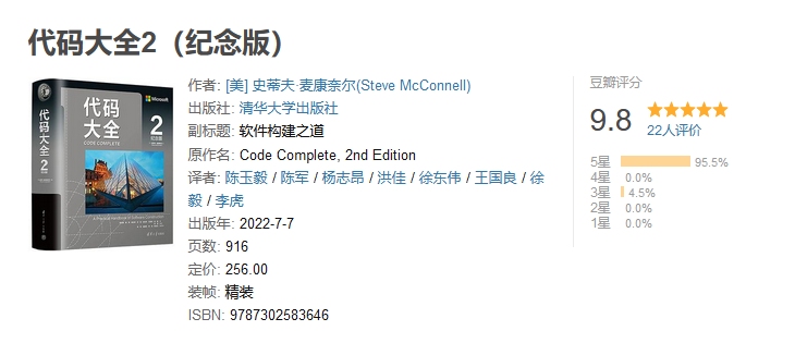 《代码大全2》是著名科技类作家史蒂夫·麦康奈尔的经典著作,是一本完整的软件构建手册,涵盖了软件构建过程中的所有细节。它从软件质量和编程思想等方面论述了软件构建的各个问题,并详细论述了紧跟时代潮流的新技术、高屋建瓴的观点、通用的概念,还含有丰富而典型的程序示例。本书所论述的技术不仅填补了初级与中高级编程技术之间的空白,而且也为程序员提供了一个有关编程技巧的信息来源。