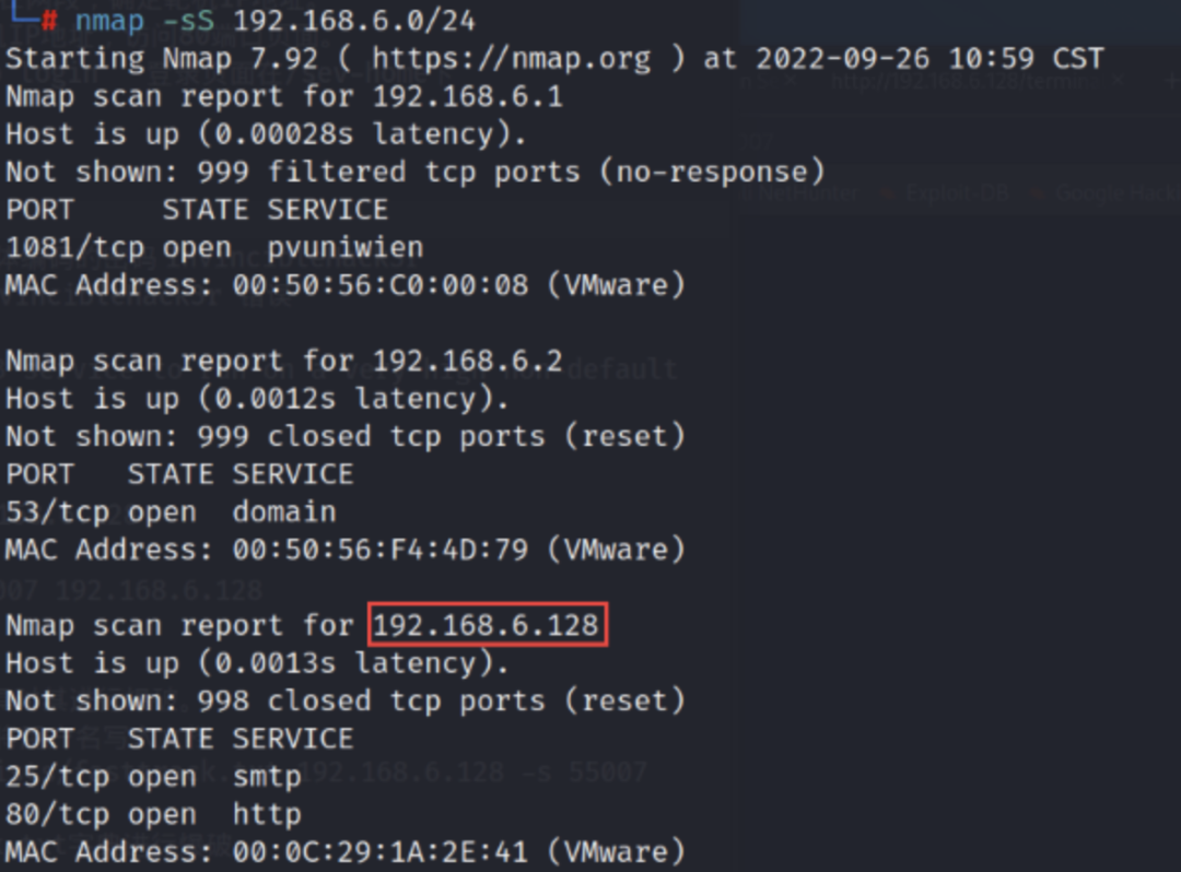 根据网卡确定靶机IP所在网段之后,使用nmap进行扫描。判断靶机IP为 192.168.6.128