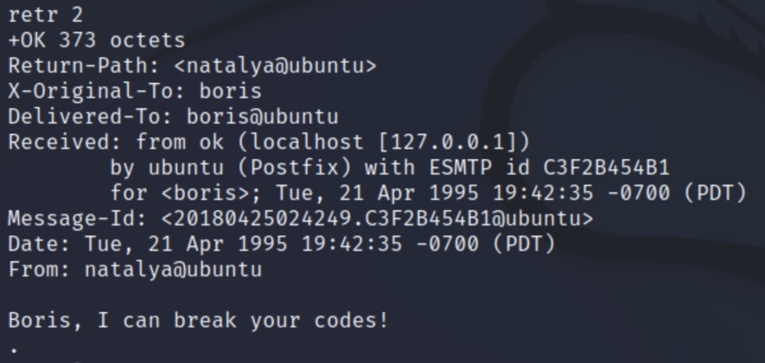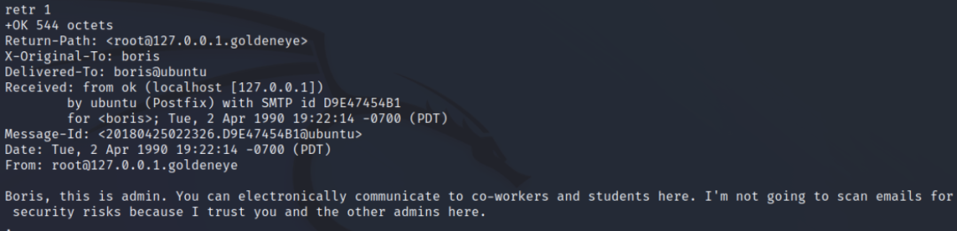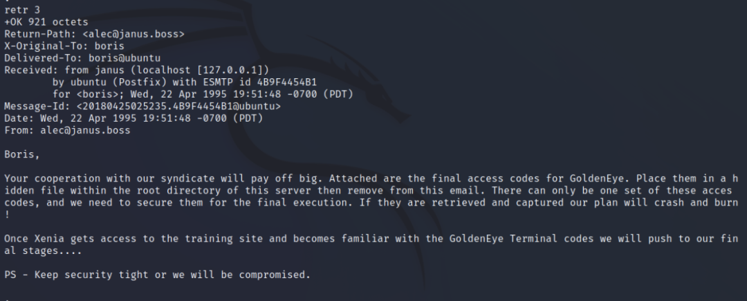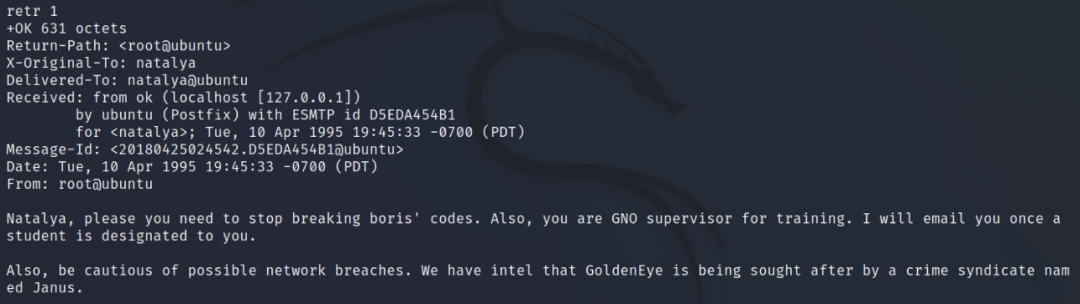 登录成功之后获得提示,邮件发送给了网络主管。pop3邮件服务在非默认端口上。