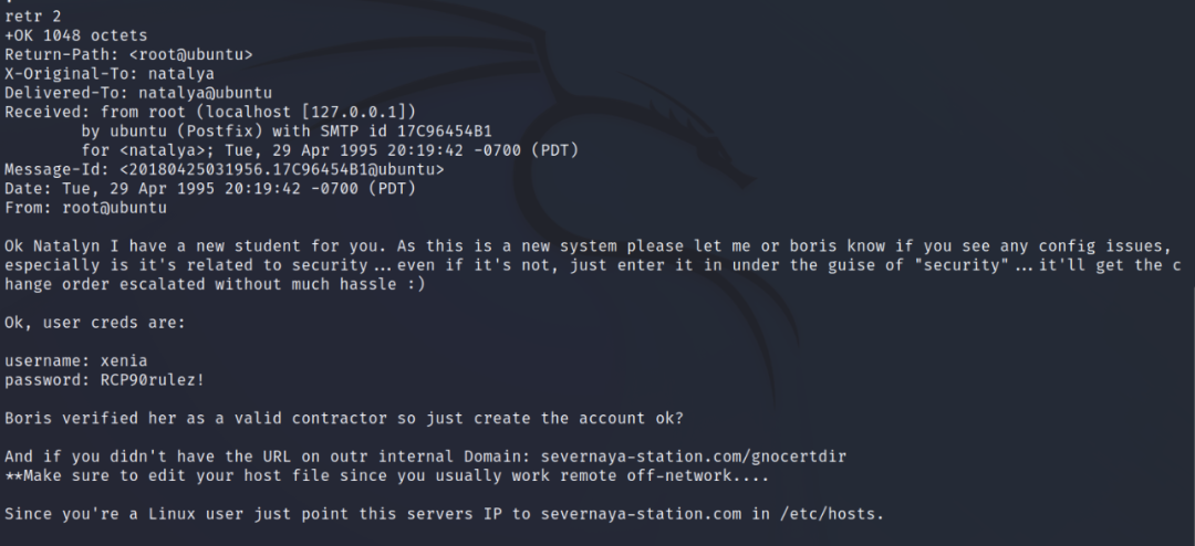 获得提示:新的账户和密码  xenia/RCP90rulez!   外网域名 severnaya-station. com/ gnocertdir 以及将/etc/hosts 文件下的 IP 指向域名 severnaya-station.com