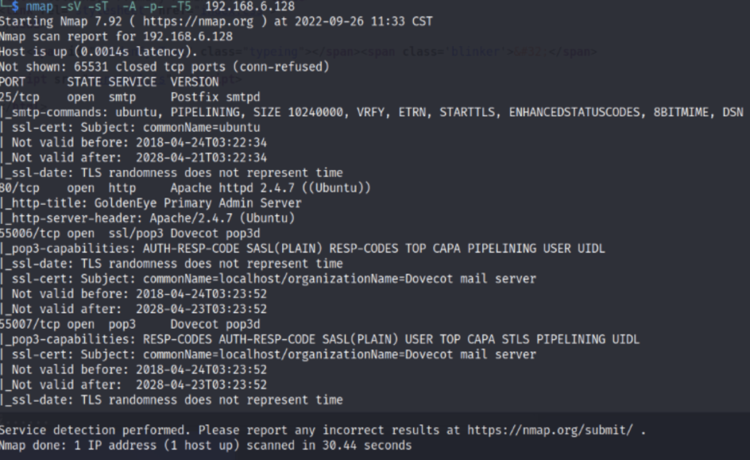nmap -sV -sT -A -p- 192.168.6.128 -T5 探测IP具体服务以及端口
