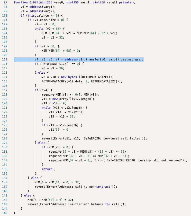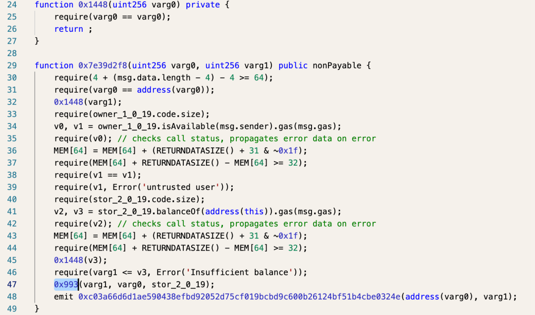 我们通过反编译 0x5ecf 合约跟进查看,0xc81daf6e 函数并未对用户传入的参数的合法性进行检查,且当 msg.sender 与 varg0 一致的情况下也将绕过 owner 检查。可以看到在 632 行调用了用户传入的 varg1 地址的 0x95b81c68 函数,返回值记为 v4,随后在 645 行调用 0x36f277 合约的 0x7e39d2f8 函数并传入用户传入的 varg0,以及从 0x95b81c68 返回的 v4。