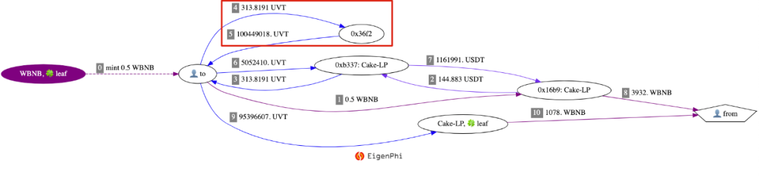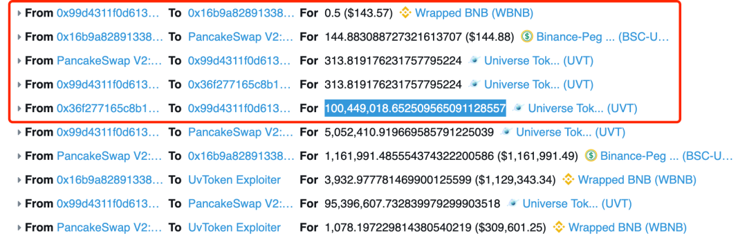 首先,攻击者用 0.5 个 BNB 在 PancakeSwap 上按照 WBNB -> BUSD -> UVT 的兑换路径兑换了 313 个 UVT 代币,并将其转入到 UvTokenWallet Eco Staking 合约后此矿池的 vault 合约就转出了 100,449,018 个 UVT 代币给到攻击者合约,从这里可以判断合约一定是受到黑客攻击。