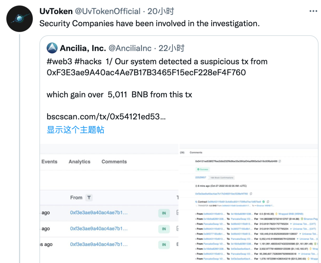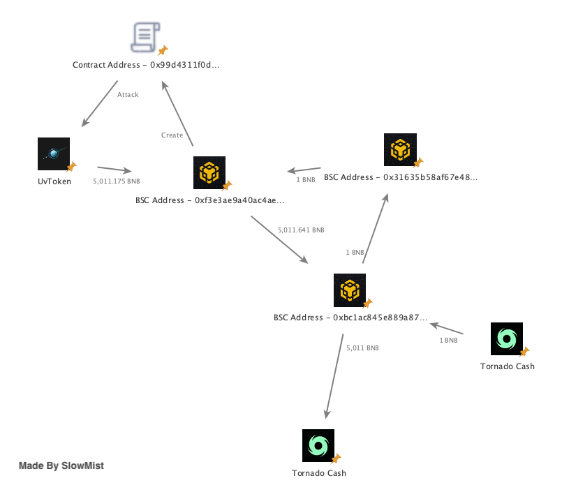据慢雾区情报,2022 年 10 月 27 号,BNB Chain 项目 UvToken 遭受黑客攻击,黑客通过其矿池合约漏洞获利超 5,000 BNB。慢雾安全团队现简要复盘分析如下: