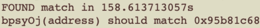 我们都知道函数签名是对函数名及其参数进行 keccak256 哈希后取前4个字节获得的,因此我们可以直接进行哈希碰撞就可以很容易得到前4个字节相同的函数签名了。我们经过实际测试发现不到三分钟就可以碰撞出 0x95b81c68 函数了。