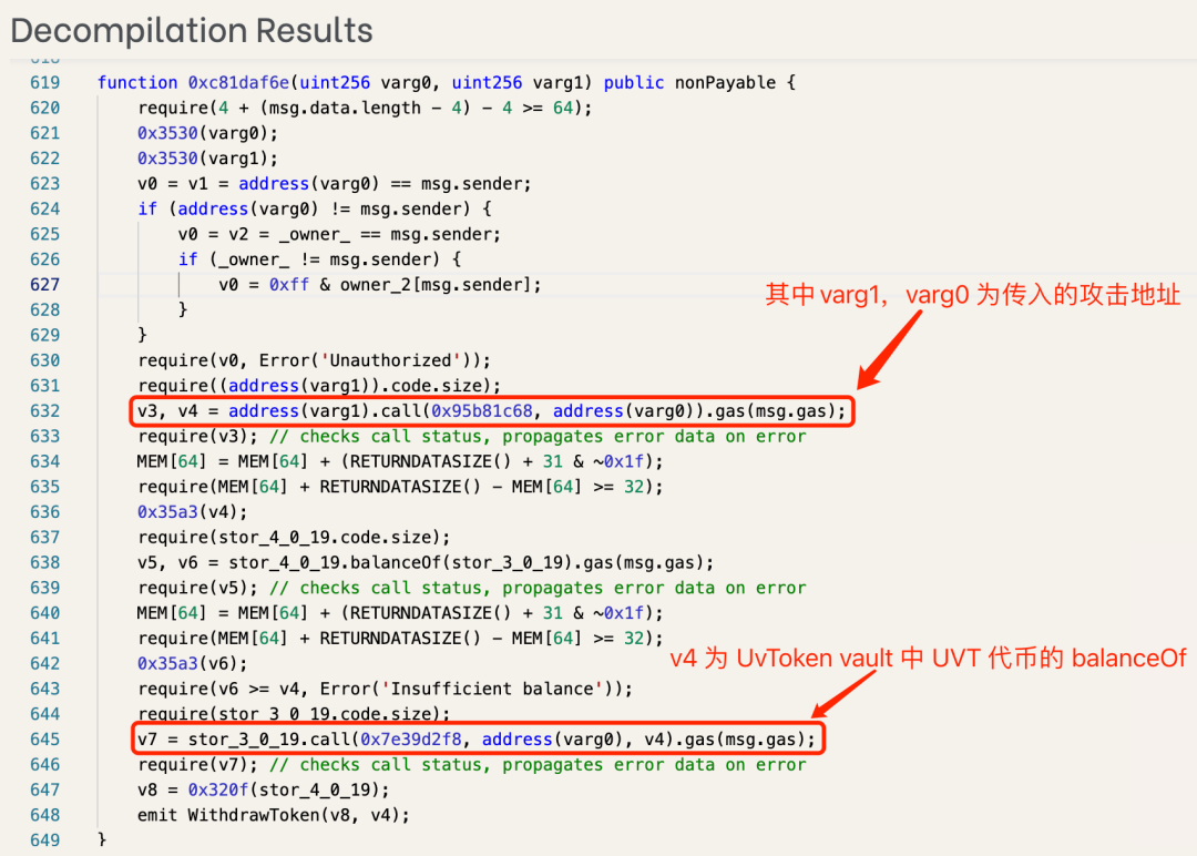 至此,我们可以知道 0xc81daf6e 函数并未对用户传入的参数的合法性进行检查,导致攻击者可以传入恶意构造的攻击合约返回所需提取的代币数量即可将 vault 中的 UVT 代币席卷一空。