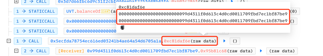 在交易细节中我们可以看到一个多亿的 UVT 代币恰好是此矿池 vault 合约中的 UVT 代币总量。在此之前,攻击合约还通过 UvToken 合约对其 staking 逻辑合约 0x5ecf 授权 UVT 代币,并调用 transferFrom 函数将 313 个 UVT 代币转入到 vault 合约中。紧接着,通过调用授权合约的 0xc81daf6e 函数,并在传参时将两个参数构造为攻击者自己创建的攻击合约地址 0x99d4,随即攻击者便收到了大量的 UVT 代币。那为什么只是简单的调用 0xc81daf6e 即可收到大量 UVT 代币呢?