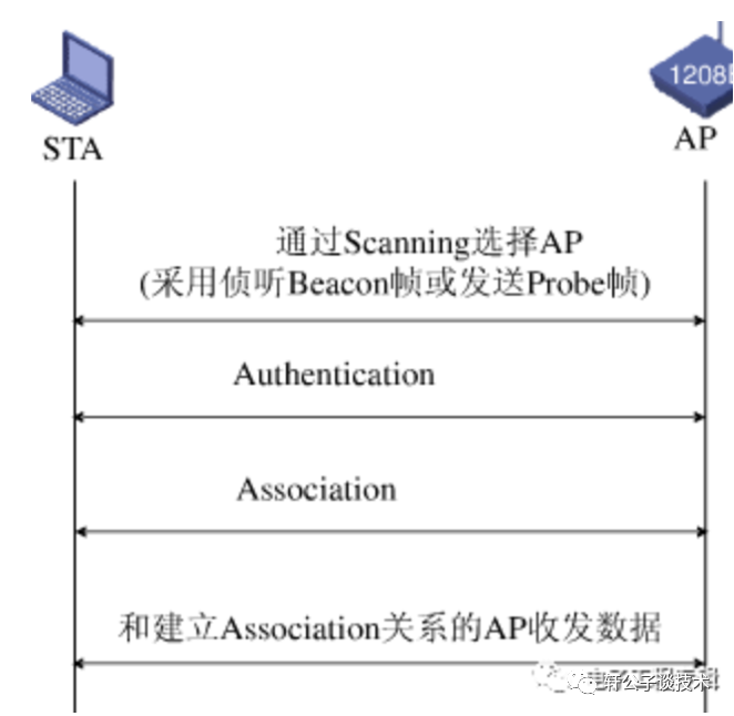 STA(工作站)启动初始化、开始正式使用AP传送数据帧前,要经过三个阶段才能够接入(802.11MAC层负责客户端与AP之间的通讯,功能包括扫描、接入、认证、加密、漫游和同步等功能):