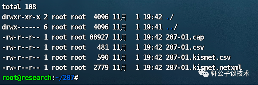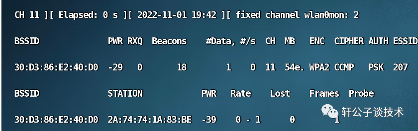 airodump-ng -c 11 --bssid 30:D3:86:E2:40:D0 -w 207 wlan0monc: 指定它的信道bssid: mac地址w: 任意文件名称,用来保存流量