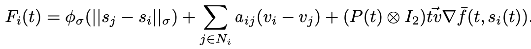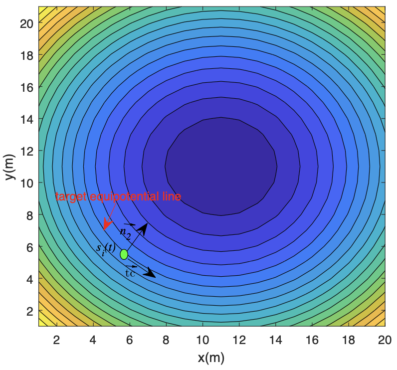 在上述AUV的输入控制中,第一部分是基于势场的梯度,该梯度被指定为保持AUV集群并同时避免碰撞;第二部分是速度匹配旨在使SDN-AUVNS中每个AUV的速度统一;最后一部分是用于跟踪等势线的导航反馈。