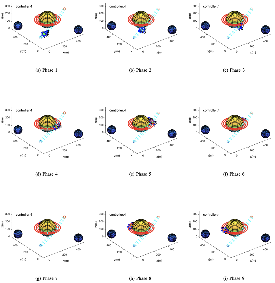 如图所示 5a至图 5i,有三个扩散源,图中为使用SDN-AUVNs在三维场景中跟踪浓度为4的等势线。此外,除污染区域的规模和SDN-AUVNs的初始位置外,所有参数均如表Ⅰ所示。即使SDN-AUVNs需要较长的时间来跟踪目标浓度,最终都能跟踪目标等势线。总体而言,图4和图5的评估结果可以证明文中提出的算法是可扩展的,对于多种应用场景是可行的。
