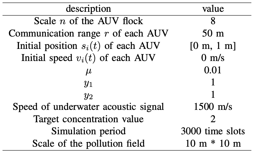 本文进行了二维的水下污染扩散跟踪(10m×10m)模拟实验,模拟实验参数如表Ⅰ所示。